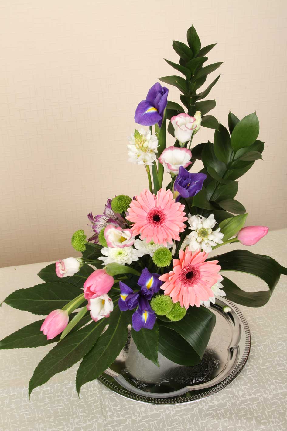 "Заполняем свободное пространство оазиса допольнительными элементами - веточками кустовой хризантемы(белой и зеленой) и альстрмерией"